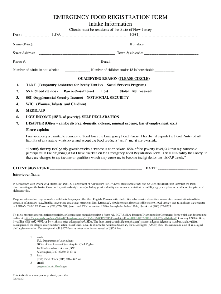 Register for emergency food assistance in New Jersey. This form collects essential client information to facilitate access to food resources.