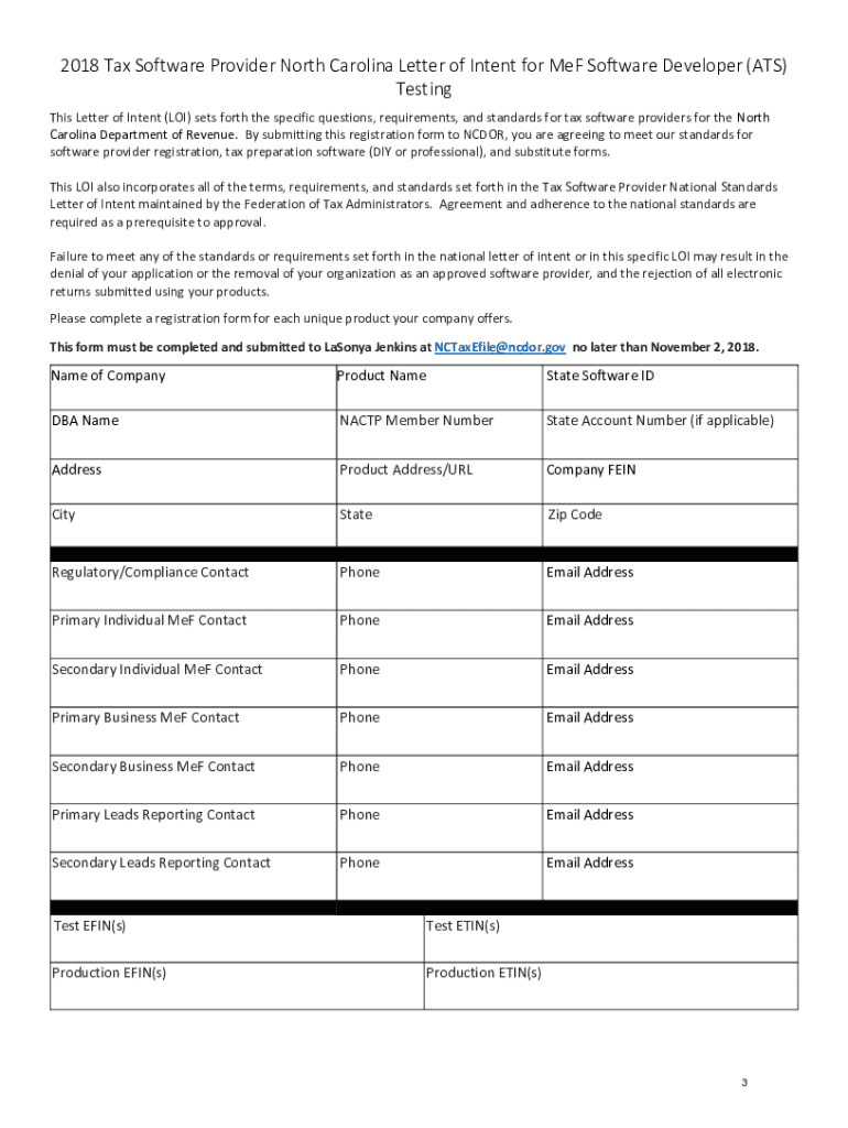 Complete the 2018 Letter of Intent for MeF Software Developer Testing with NCDOR. Ensure compliance with required software standards for tax submissions.