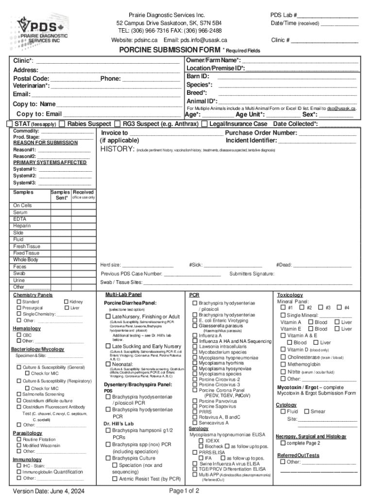 Complete the required fields for porcine submissions with Prairie Diagnostic Services Inc., ensuring accurate data for effective diagnosis and treatment.