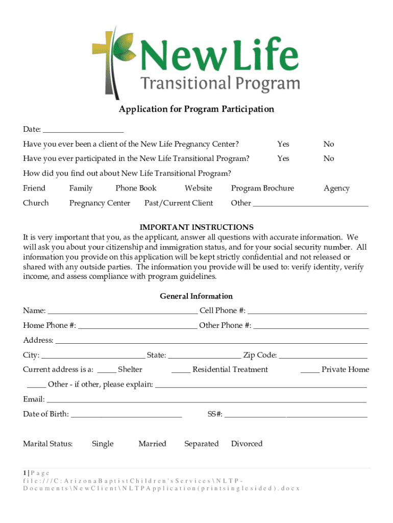 Complete the application for participation in the New Life Transitional Program, ensuring accuracy in personal and confidential information.