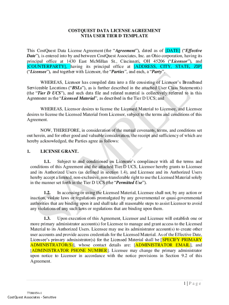 COSTQUEST DATA LICENSE AGREEMENT NTIA USER TIER D TEMPLATE This CostQuest Data License Agreement (the Agreement), dated as of [DATE] (Effective Date), is entered into by and between CostQuest Associates,