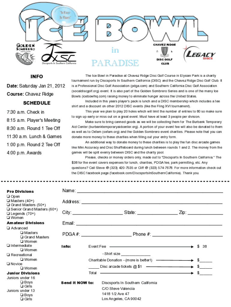 Join the 2012 Ice Bowl in Paradise at Chavez Ridge. Enjoy disc golf while supporting local charities to eliminate hunger. Sign up early for limited spots!