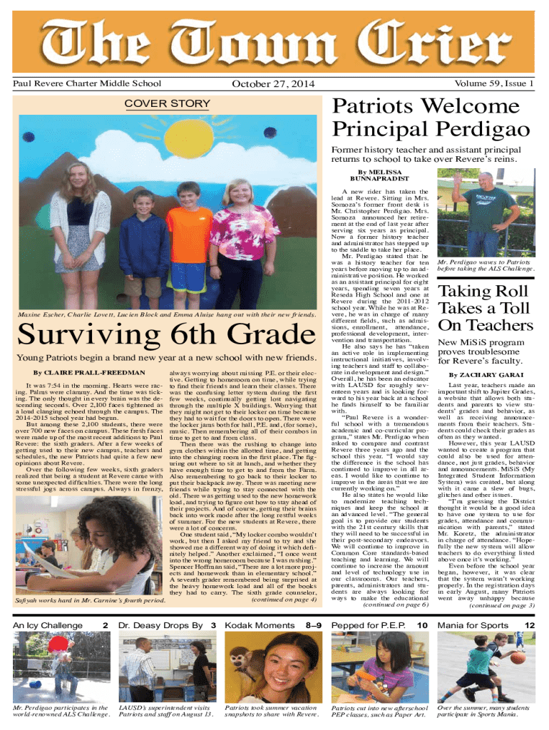 October 27, 2014Paul Revere Charter Middle SchoolVolume 59, Issue 1Patriots Welcome Principal PerdigaoCOVER STORYFormer history teacher and assistant principal returns to school to take over Reveres reins. By MELISSA BUNNAPRADISTMaxine Escher, Charlie Lovett, Lucien Block and Emma Aluise hang out with their new friends.Surviving 6th Grade Young Patriots begin a brand new year at a new school with new friends. By CLAIRE PRALLFREEDMAN It was 7:54 in the morning. Hearts were racing