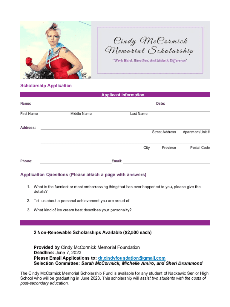 Scholarship Application Applicant Information Name:Date:First NameMiddle NameLast NameAddress:City Phone:Street AddressApartment/Unit #ProvincePostal CodeEmail:Application Questions (Please attach