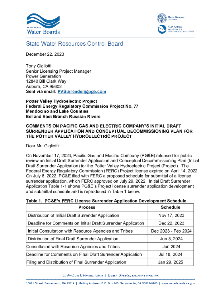 Review of PG&E\'s Initial Draft Surrender Application for the Potter Valley Hydroelectric Project, detailing comments and recommendations to ensure compliance with environmental and water quality regulations.