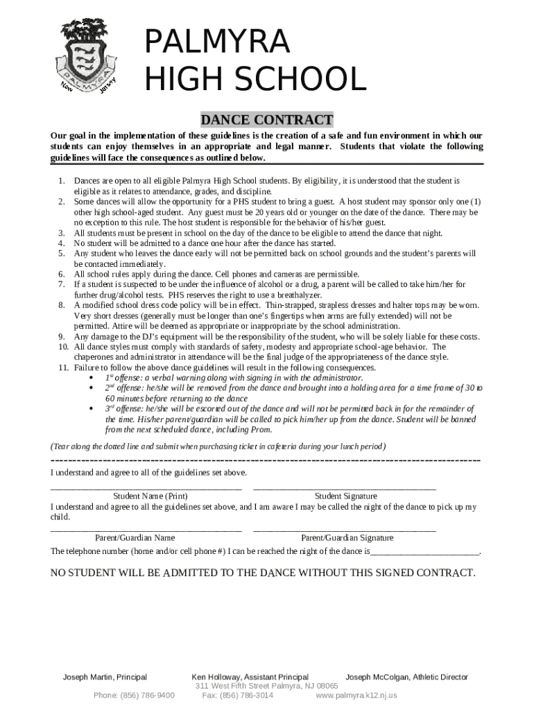 The Dance Contract is a Word document needed to be submitted to the relevant address in order to provide some info. It must be completed and signed, which is possible manually, or using a particular solution e. g. PDFfiller. This tool helps to fill out any PDF or Word document directly in your browser, customize it depending on your purposes and put a legally-binding electronic signature. Right after completion, you can send the Dance Contract to the relevant person, or multiple individuals via email or fax. The template is printable too because of PDFfiller feature and options offered for printing out adjustment. In both electronic and in hard copy, your form should have a neat and professional look. It's also possible to turn it into a template for further use, without creating a new file over and over. All you need to do is to amend the ready document.