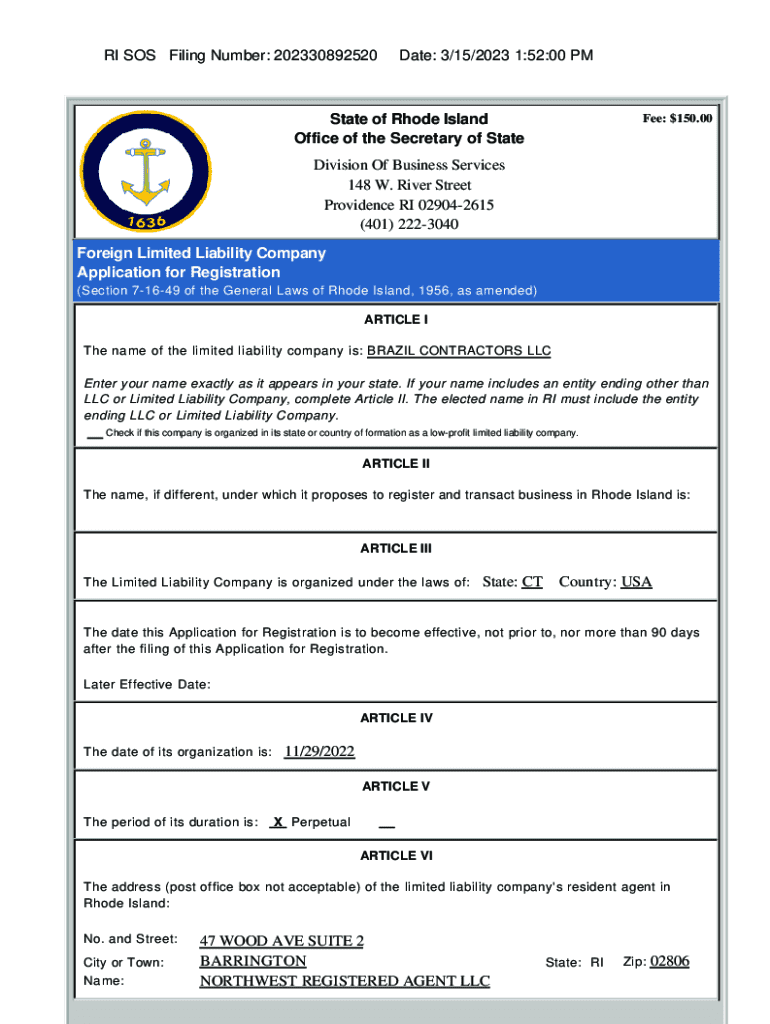 Official application for registration of BRAZIL CONTRACTORS LLC as a foreign limited liability company in Rhode Island, filed on March 15, 2023.