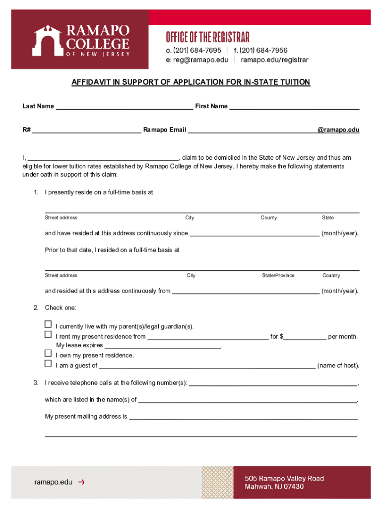 AFFIDAVIT IN SUPPORT OF APPLICATION FOR INSTATE TUITION Last NameFirst Name#Ramp Email@ramapo.eduI,, claim to be domiciled in the State of New Jersey and thus am eligible for lower tuition rates established