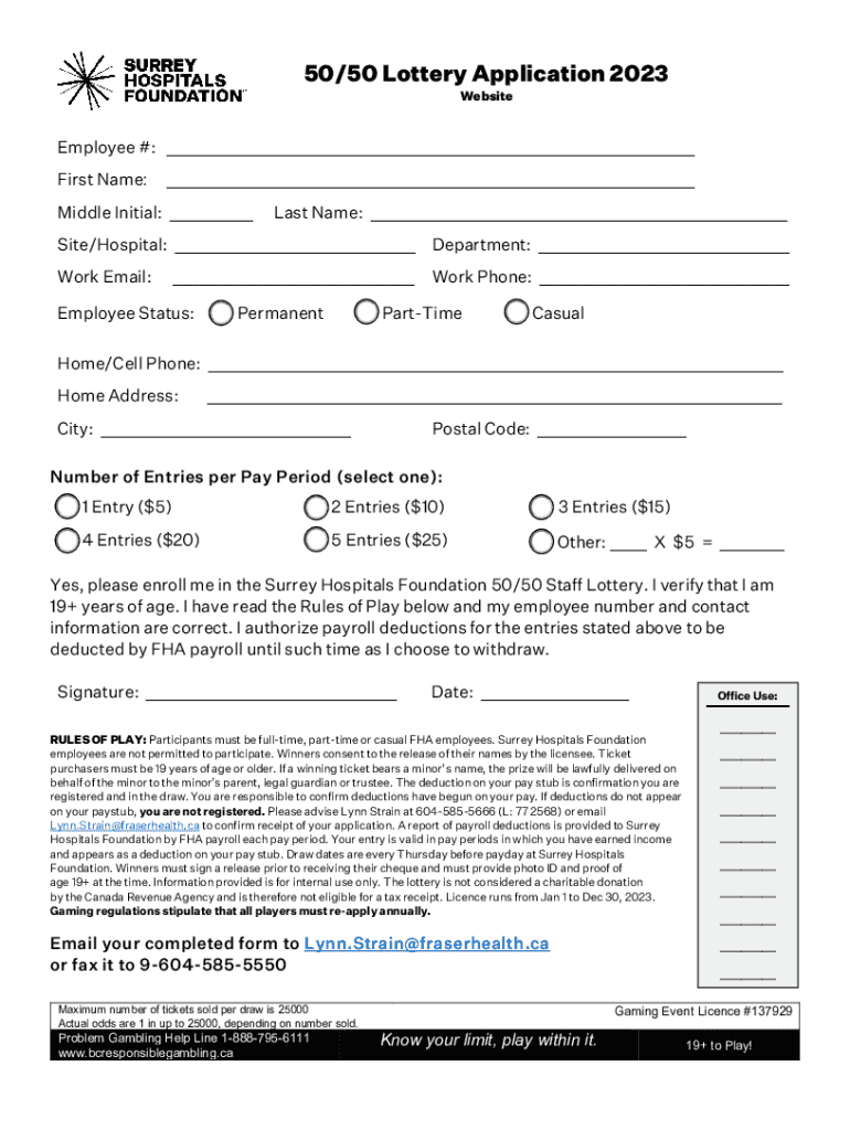Apply for the Surrey Hospitals Foundation 50/50 Staff Lottery 2023. Participate for a chance to win while supporting your hospital community. Age 19+ required.