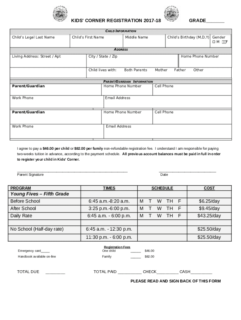 The Kids' Corner Registration 2017-18 is a fillable form in MS Word extension that has to be filled-out and signed for certain reasons. Next, it is furnished to the actual addressee to provide specific details of certain kinds. The completion and signing is available in hard copy or using a trusted application e. g. PDFfiller. These tools help to fill out any PDF or Word file without printing them out. It also allows you to customize it according to your needs and put a valid electronic signature. Once finished, you send the Kids' Corner Registration 2017-18 to the recipient or several of them by mail or fax. PDFfiller has a feature and options that make your document of MS Word extension printable. It includes different settings when printing out. It does no matter how you file a form after filling it out - in hard copy or electronically - it will always look neat and firm. In order not to create a new document from the beginning again and again, make the original document into a template. Later, you will have an editable sample.