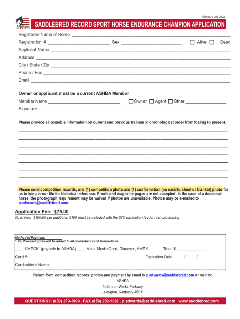 Effective Oct 2022SADDLEBRED RECORD SPORT HORSE ENDURANCE CHAMPION APPLICATION
