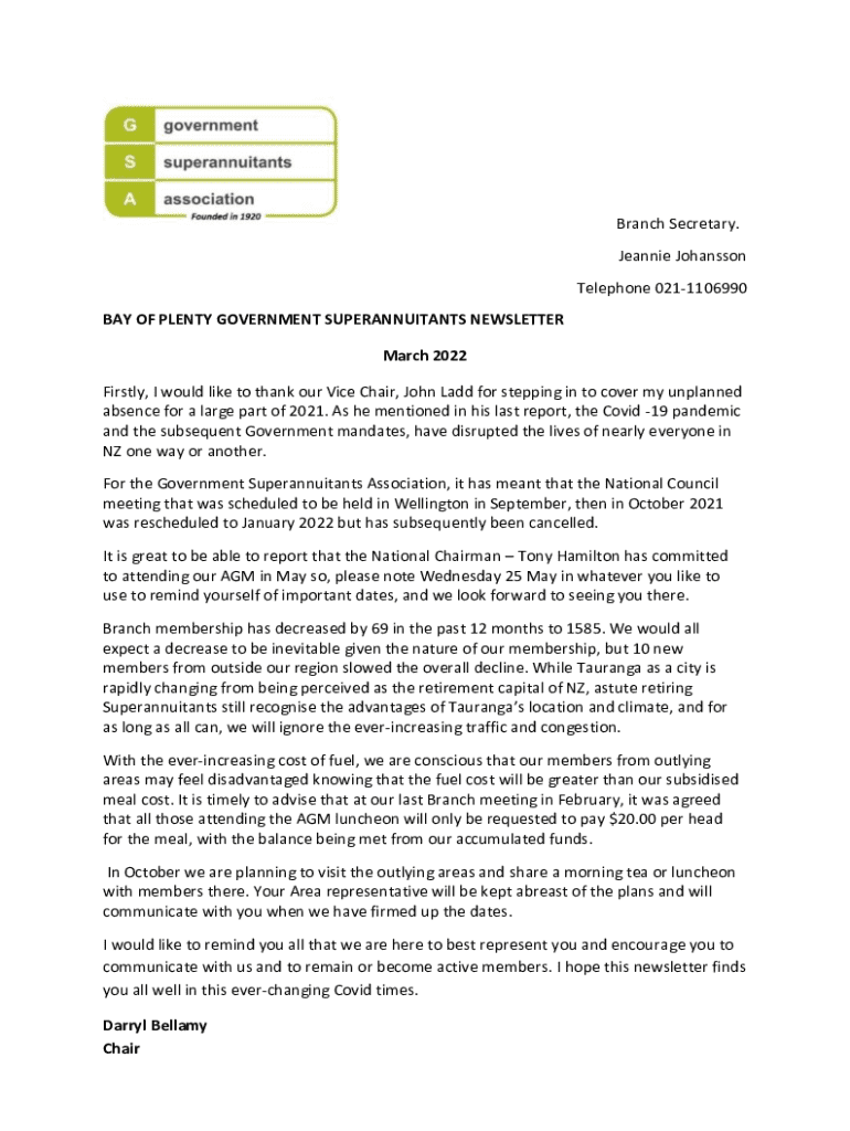 Stay updated with the Bay of Plenty Government Superannuitants Newsletter for March 2022. Important AGM details, membership information, and community updates included.