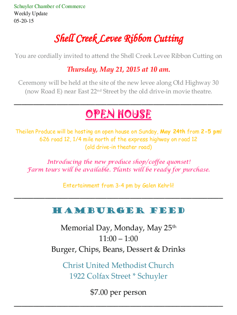 Stay updated with the Schuyler Chamber of Commerce Weekly Update featuring local events, job openings, and more for May 2015. Join us for community activities!