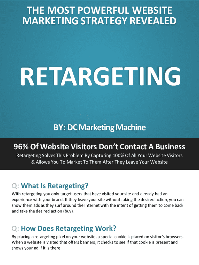 THE MOST POWERFUL WEBSITE MARKETING STRATEGY REVEALEDRETARGETING BY: DC Marketing Machine 96% Of Website Visitors Don't Contacts A Business Retargeting Solves This Problem By Capturing 100% Of All