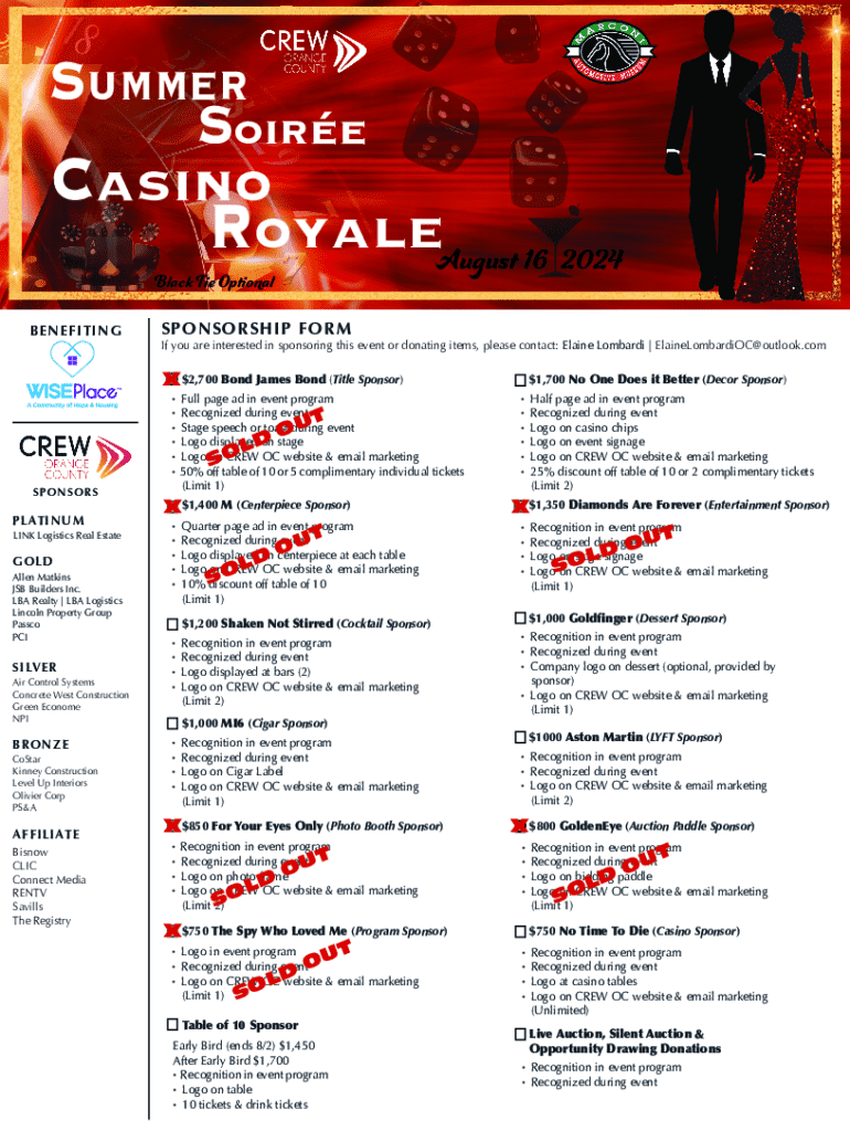 Summer SoireCasino RoyaleAugust 16 2024Black Tie OptionalBENEFITINGS PON SORSP L ATINUM LINK Logistics Real EstateGO LD Allen Matkins JSB Builders Inc. LBA Realty | LBA Logistics Lincoln Property