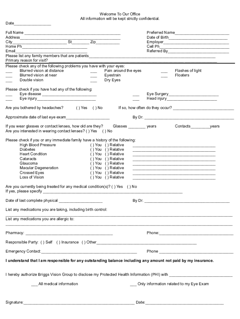 Welcome To Our Office All information will be kept strictly confidential. Date___ Full Name ___ Preferred Name___ Address___ Date of Birth___ City___ St___ Zip___ Employer___ Home Ph___ Cell Ph___