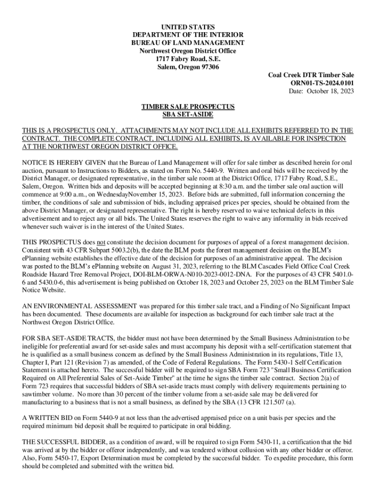UNITED STATES DEPARTMENT OF THE INTERIOR BUREAU OF LAND MANAGEMENT Northwest Oregon District Office 1717 Fabry Road, S.E. Salem, Oregon 97306 Coal Creek DTR Timber Sale ORN01TS2024.0101 Date: October 18, 2023 TIMBER SALE PROSPECTUS SBA SETASIDE THIS IS A PROSPECTUS ONLY. ATTACHMENTS MAY NOT INCLUDE ALL EXHIBITS REFERRED TO IN THE CONTRACT. THE COMPLETE CONTRACT, INCLUDING ALL EXHIBITS, IS AVAILABLE FOR INSPECTION AT THE NORTHWEST OREGON DISTRICT OFFICE. NOTICE IS HEREBY GIVEN that the Bureau of