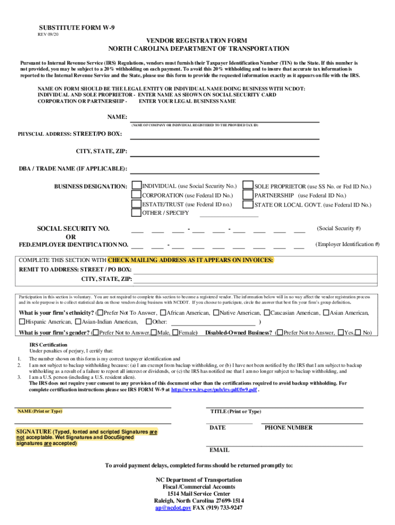 SUBSTITUTE FORM W9 REV 09/20VENDOR REGISTRATION FORM NORTH CAROLINA DEPARTMENT OF TRANSPORTATION Pursuant to Internal Revenue Service (IRS) Regulations, vendors must furnish their Taxpayer Identification