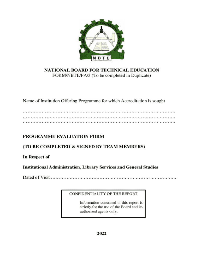 NATIONAL BOARD FOR TECHNICAL EDUCATION FORM/NOTE/PA/3 (To be completed in Duplicate)Name of Institution Offering Program for which Accreditation is sought. . .Program EVALUATION FORM (TO BE COMPLETED
