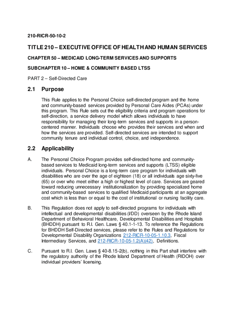 This document outlines the regulations for the Self-Directed Care under Rhode Island\'s Medicaid Long-Term Services and Supports for 2024, focusing on eligibility and program operations.