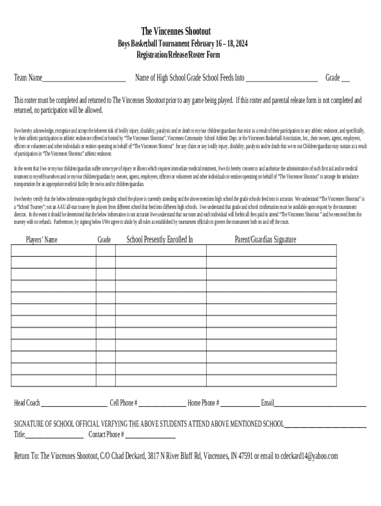 The Vincennes Shootout Registration is a fillable form in MS Word extension needed to be submitted to the relevant address in order to provide specific info. It needs to be completed and signed, which is possible in hard copy, or using a particular software such as PDFfiller. This tool helps to fill out any PDF or Word document right in the web, customize it depending on your needs and put a legally-binding e-signature. Right after completion, the user can easily send the Vincennes Shootout Registration to the relevant individual, or multiple ones via email or fax. The blank is printable too thanks to PDFfiller feature and options presented for printing out adjustment. In both digital and in hard copy, your form will have a organized and professional appearance. It's also possible to save it as the template to use it later, without creating a new blank form from the beginning. All you need to do is to edit the ready sample.