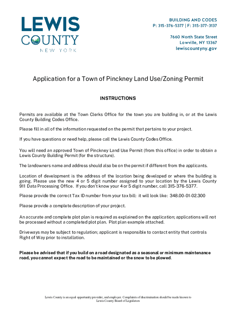 BUILDING AND CODES P: 3153765377 | F: 3153773137 7660 North State Street Lowville, NY 13367lewiscountyny.govApplication for a Town of Pinckney Land Use/Zoning Permit INSTRUCTIONS Permits are available
