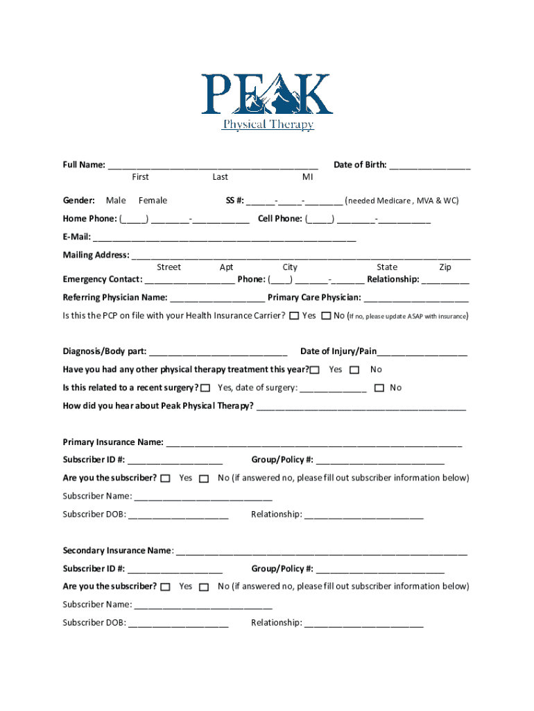 Full Name: ___ First Last MI Gender:MaleFemaleDate of Birth: ___SS #: _________ (needed Medicare, MVA & WC)Home Phone: (___) ______ Cell Phone: (___) ______ Email: ___ Mailing Address: ___ Street