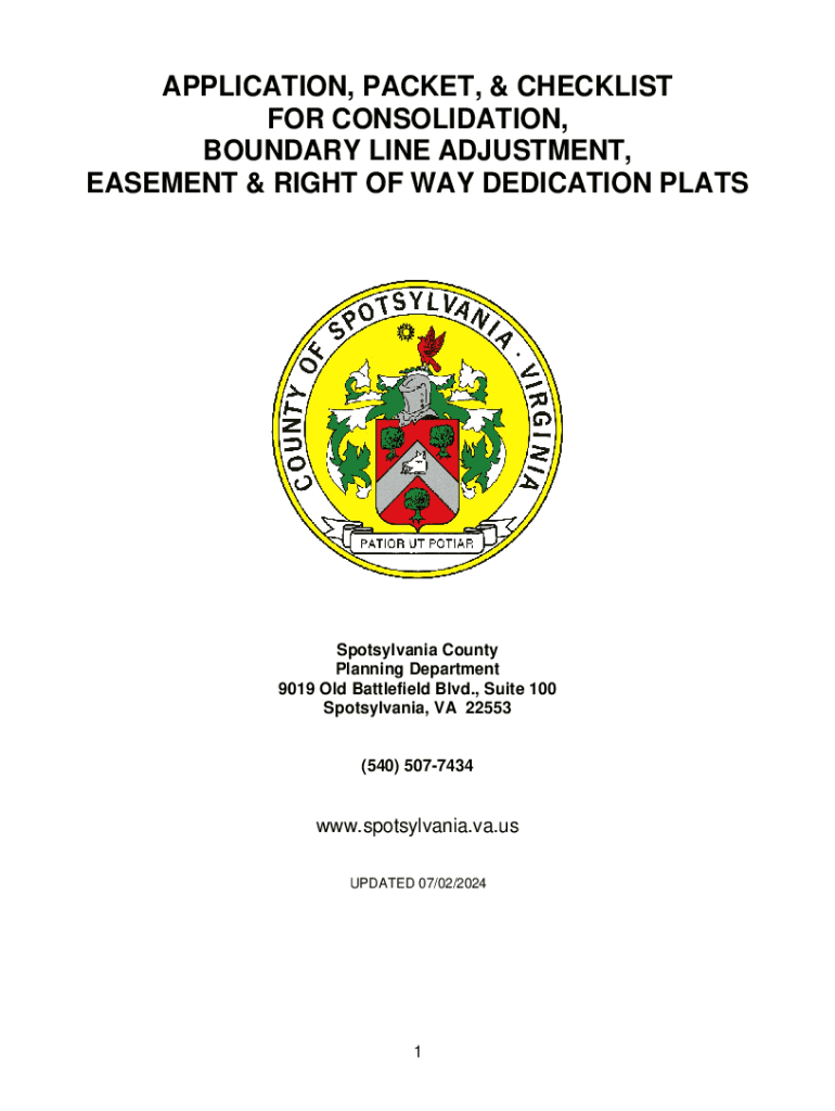 APPLICATION, PACKET, & CHECKLIST FOR CONSOLIDATION, BOUNDARY LINE ADJUSTMENT, EASEMENT & RIGHT OF WAY DEDICATION PLATSSpotsylvania County Planning Department 9019 Old Battlefield Blvd., Suite 100