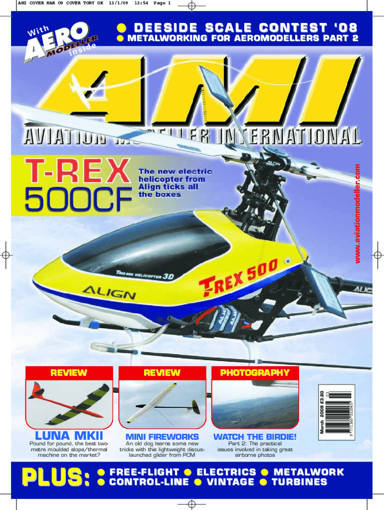 AMI COVER MAR O9 COVER TONY OKWi13/1/0913:54Page 1 DEESIDE SCALE CONTEST 08th ins METALWORKING FOR AEROMODELLERS PAR T 2idePHOTOGRAPHYLUNA MKIIMINI FIREWORKSWATCH THE BIRDIE!An old dog learns some new tricks with this lightweight discuslaunched glider from PCMPart 2: The practical issues involved in taking great airborne photosPound for pound, the best twometre moulded slope/thermal machine on the market?PLUS: FREEFLIGHT ELECTRICS MET AL WORK