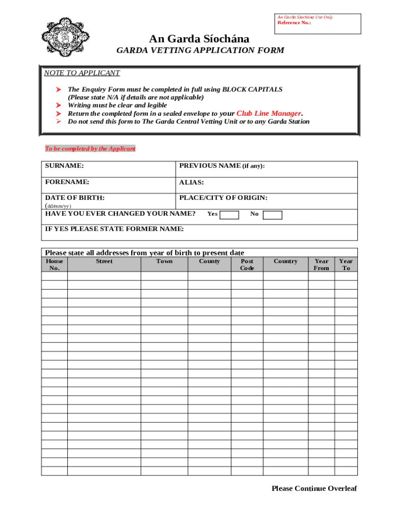 The Garda Vetting Application is a fillable form in MS Word extension that can be completed and signed for specific reasons. Then, it is furnished to the relevant addressee in order to provide specific info of certain kinds. The completion and signing is possible manually or via a suitable tool e. g. PDFfiller. These tools help to complete any PDF or Word file without printing out. While doing that, you can edit it depending on your needs and put an official legal digital signature. Once you're good, you send the Garda Vetting Application to the recipient or several ones by email and even fax. PDFfiller provides a feature and options that make your Word form printable. It has different options for printing out. No matter, how you'll deliver a form - physically or electronically - it will always look well-designed and firm. In order not to create a new editable template from scratch all the time, turn the original file into a template. After that, you will have an editable sample.