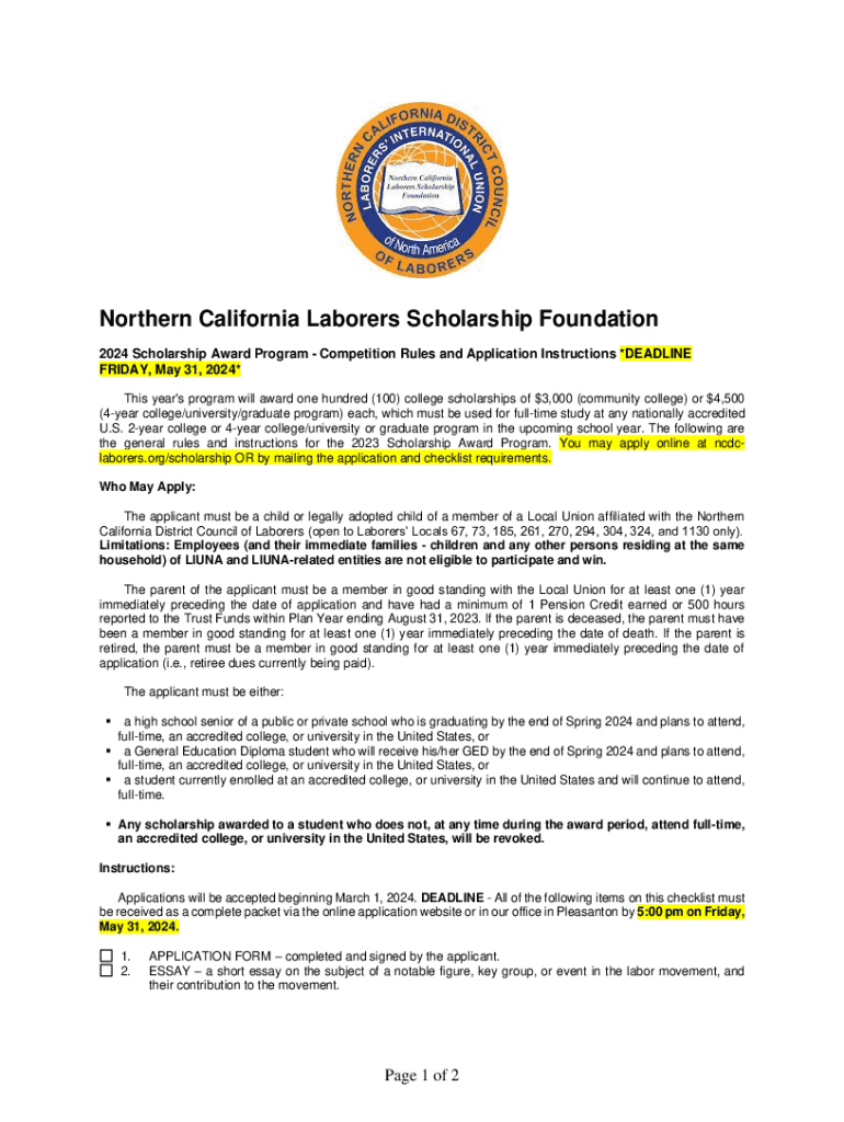 Apply for the 2024 Northern California Laborers Scholarship Program. One hundred scholarships of $3,000 or $4,500 available for eligible students.