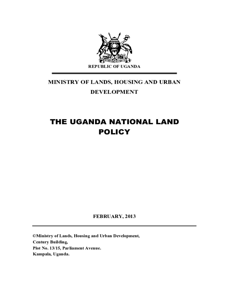 This document outlines the Uganda National Land Policy of 2013, emphasizing land management, utilization, and governance for sustainable development.