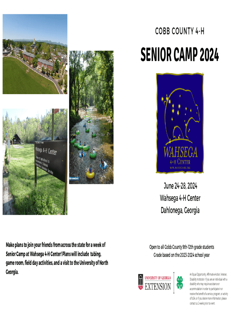 Register for Cobb County 4-H Senior Camp 2024 at Washed 4-H Center. Join us for tubing, games, and activities from June 24-28. Don\'t miss out!