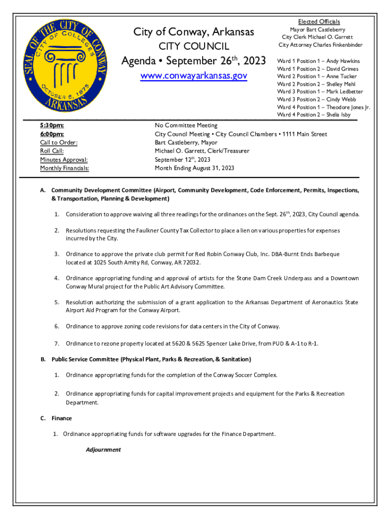City of Conway, Arkansas CITY COUNCILElected Officials Mayor Bart Castleberry City Clerk Michael O. Garrett City Attorney Charles FinkenbinderAgenda September 26th, 2023Ward 1 Position 1 Andy Hawkins