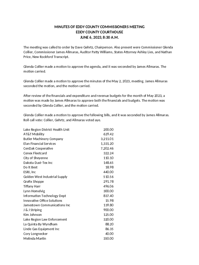 Also present were Commissioner Glenda Collier, Commissioner James Allmaras, Auditor Patty Williams, States Attorney Ashley Lies, and Nathan Price, New Rockford Transcript: frequently asked questions