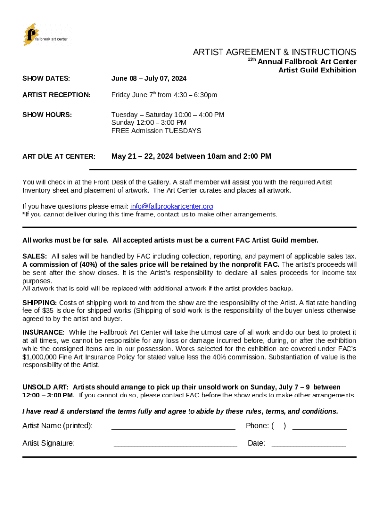 The Artist Agreement & Instructions is a writable document that should be submitted to the specific address to provide specific info. It needs to be filled-out and signed, which is possible in hard copy, or with a certain software e. g. PDFfiller. It helps to complete any PDF or Word document directly from your browser (no software requred), customize it depending on your purposes and put a legally-binding e-signature. Right after completion, you can send the Artist Agreement & Instructions to the appropriate person, or multiple individuals via email or fax. The blank is printable too thanks to PDFfiller feature and options proposed for printing out adjustment. In both electronic and in hard copy, your form will have a organized and professional appearance. It's also possible to save it as the template to use it later, there's no need to create a new blank form again. All you need to do is to customize the ready template.