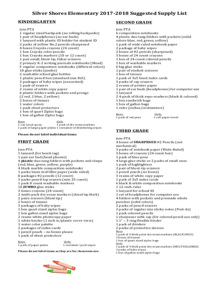 SilverShoresElementary20172018SuggestedSupplyListKINDERGARTENJoinPTA 1regularsizedbackpack(norollingbackpacks) 1pairofheadphones(no earbuds) 1lanyardwithplasticIDholderforstudentID 2packsofyellowNo.2pencilssharpened