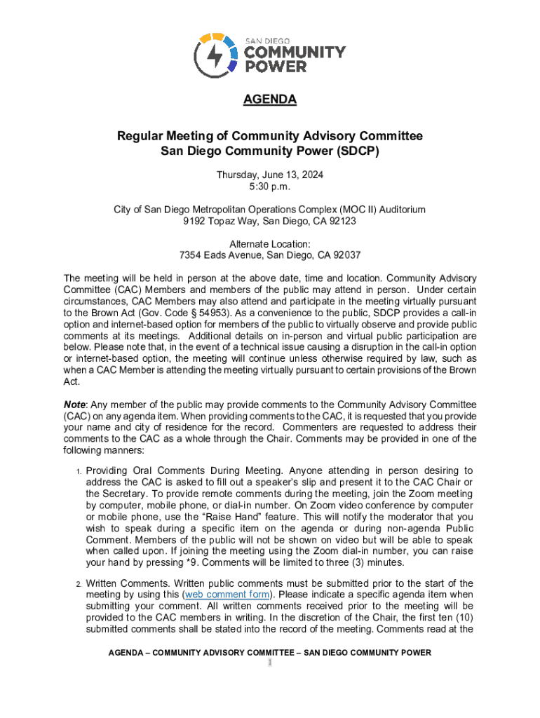 AGENDA Regular Meeting of Community Advisory Committee San Diego Community Power (SDCP) Thursday, June 13, 2024 5:30 p.m. City of San Diego Metropolitan Operations Complex (MOC II) Auditorium 9192 Topaz Way, San Diego, CA 92123 Alternate Location: 7354 Eads Avenue, San Diego, CA 92037 The meeting will be held in person at the above date, time and location. Community Advisory Committee (CAC) Members and members of the public may attend in person. Under certain circumstances, CAC Members may...
