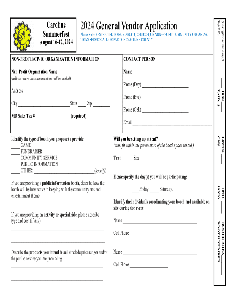 To fill out the general vendor booth application, vendors typically need to provide details such as their business name, contact information, description of products, requested booth size, and payment information for the booth fee.