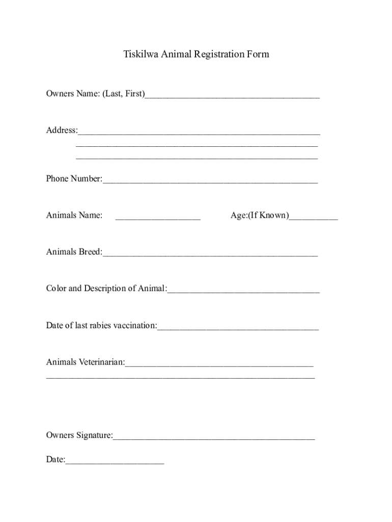 Effortlessly register your pets with the Tiskilwa Animal Registration Form. Capture essential details to ensure your animals are officially documented.
