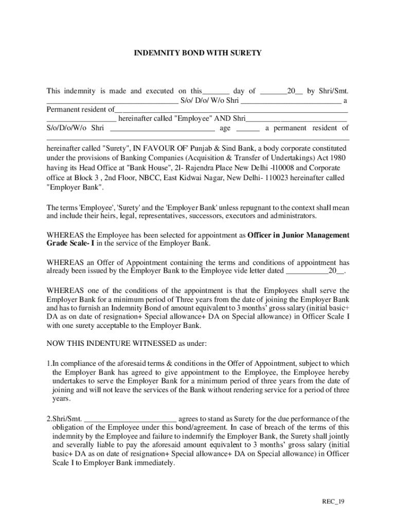 INDEMNITY BOND WITH SURETYThis indemnity is made and executed on this___ day of ___20__ by Shri/Smt. ___ S/o/ D/o/ W/o Shri ___ a Permanent resident of___ ___ hereinafter called \"Employee\" AND Shri___
