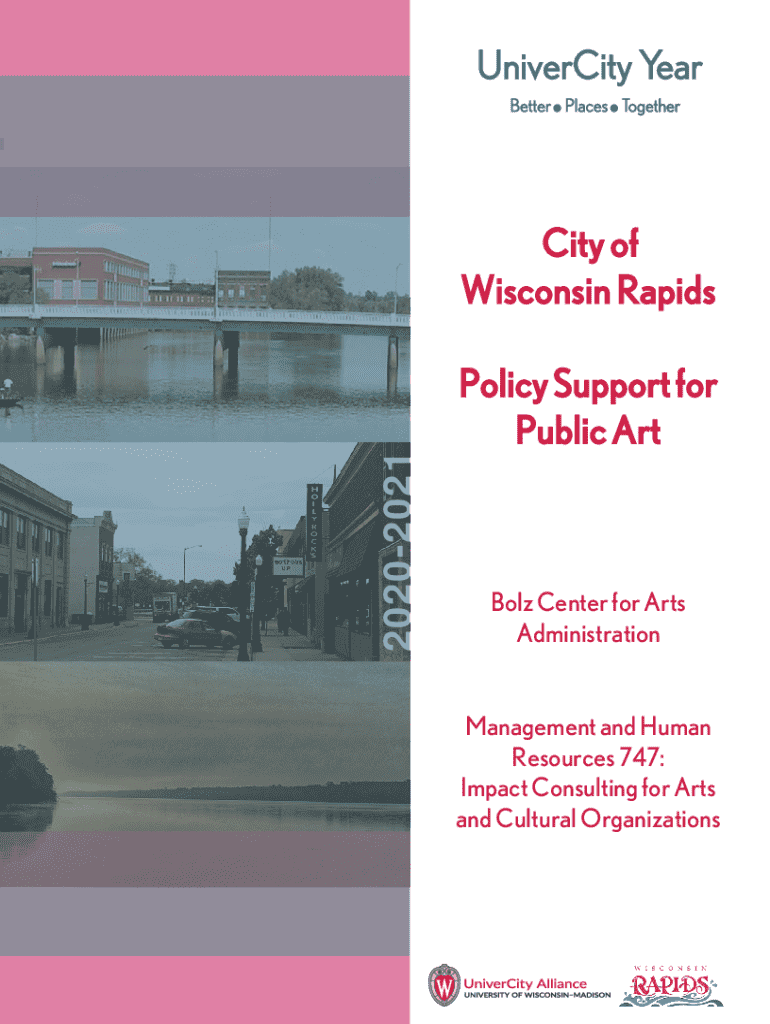 UniverCity Year Better Places TogetherCity of Wisconsin Rapids20202021Policy Support for Public ArtBolz Center for Arts Administration Management and Human Resources 747: Impact Consulting for Arts and Cultural OrganizationsPrepared by the Public Arts Consulting Team (PACT): Ginger Ann, Brian Cowing, Bailey Curtis, Lexi Janssen, Elena Duran, Taeli Reistad Completed as part of a yearlong course at the University of WisconsinMadison and in partnership with UniverCity Alliance. With