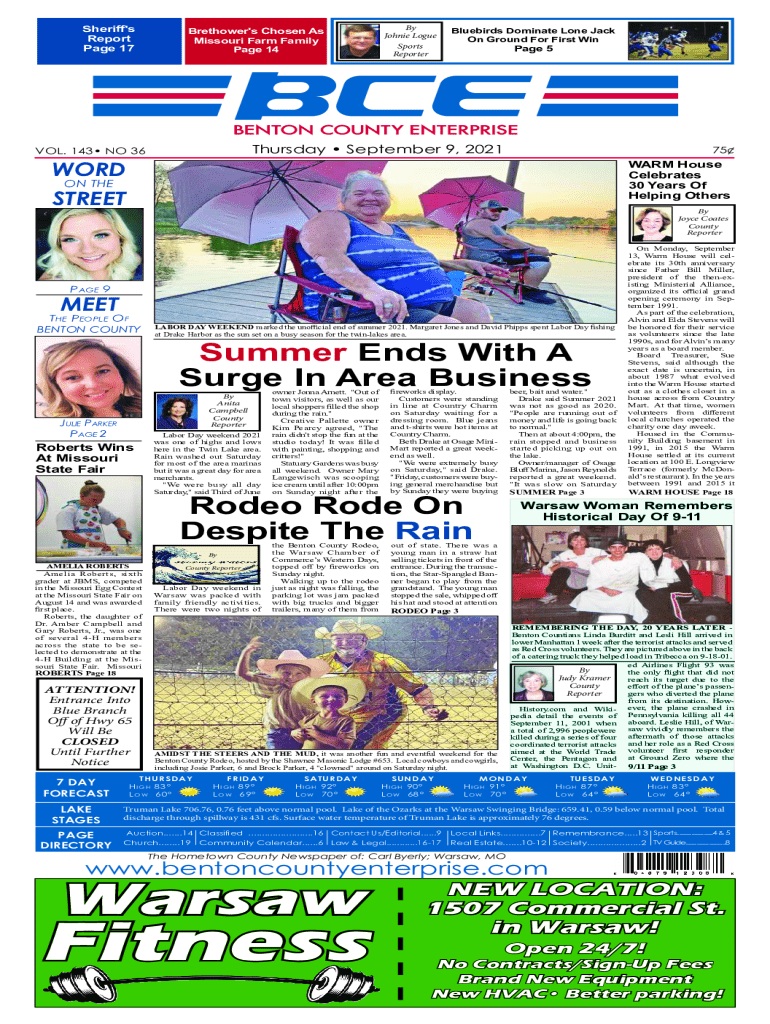 Sheriff\'s Report Page 17Brethower\'s Chosen As Missouri Farm Family Page 14By Johnie Logue Sports ReporterBluebirds Dominate Lone Jack On Ground For First WinPage 5Thursday September 9, 2021VoL. 143 No 3675WARM House Celebrates 30 Years Of Helping OthersWORD oN TheSTREETBy Joyce Coates County ReporterPage 9MEET The PeoPle of BeNToN CoUNTYLABOR DAY WEEKEND marked the unofficial end of summer 2021. Margaret Jones and David Phipps spent Labor Day fishing at Drake