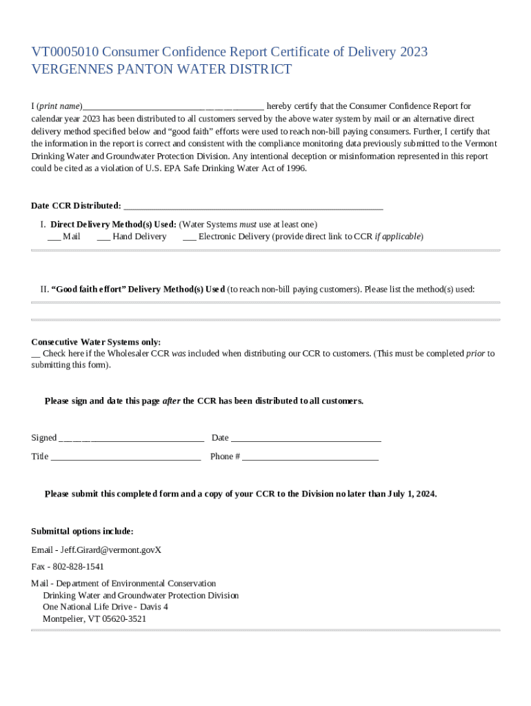 Template Vt0005010 Consumer Confidence Report Certificate of Delivery instructions