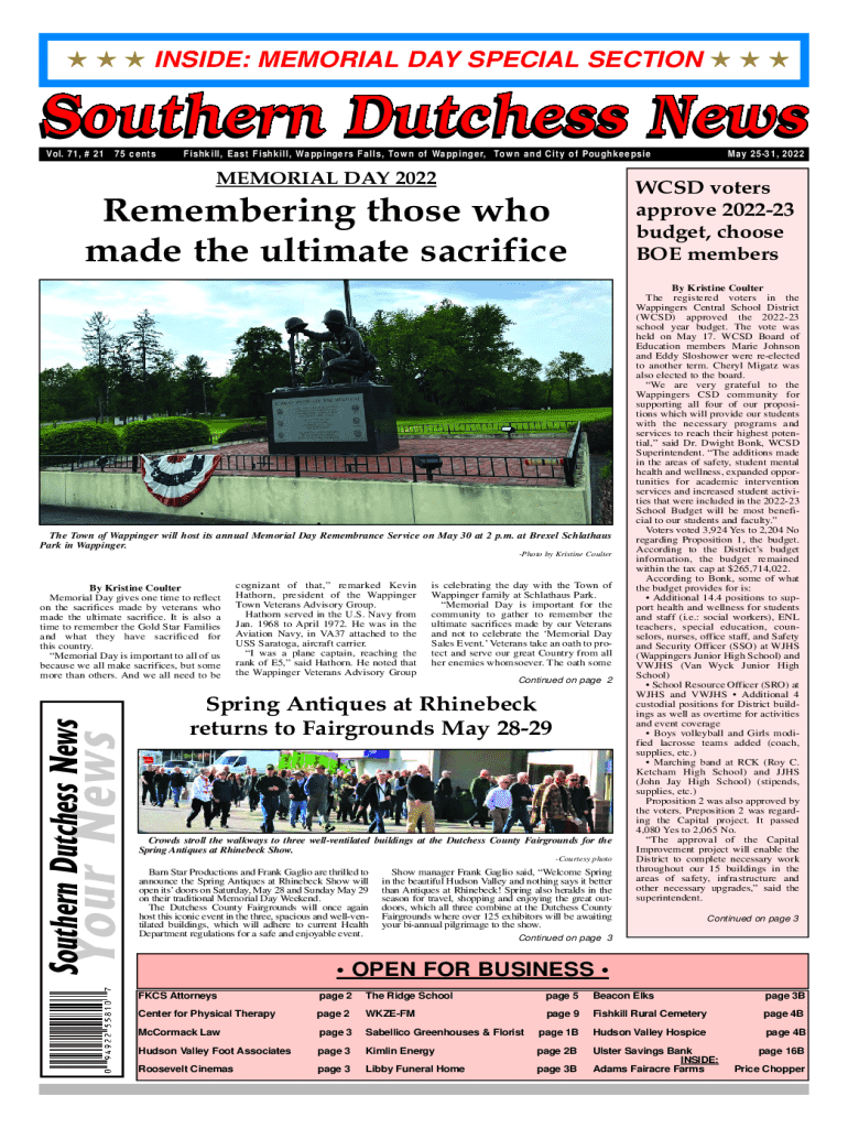 INSIDE: MEMORIAL DAY SPECIAL SECTION Vol. 71, # 21 75 centsFishkill, East Fish kill, Happiness Falls, Town of Mapping, Town and City of PoughkeepsieMEMORIAL DAY 2022WCSD voters