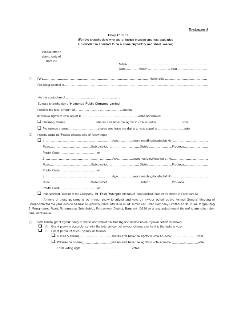 Enclosure 8 Proxy Form C. (For the shareholders who are a foreign investor and has appointed a custodian in Thailand to be a share depository and share keeper) Please attach stamp duty of Baht 20Made