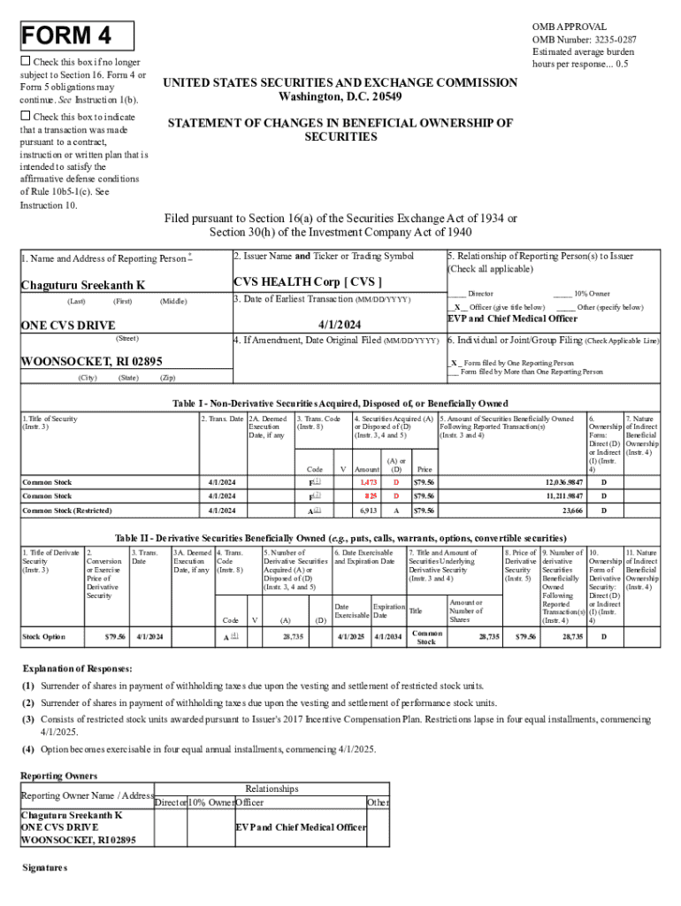 This SEC Form 4 reports changes in beneficial ownership of CVS Health Corp securities, detailing transactions made by executive Srikanth K. Chaguturu in 2024.