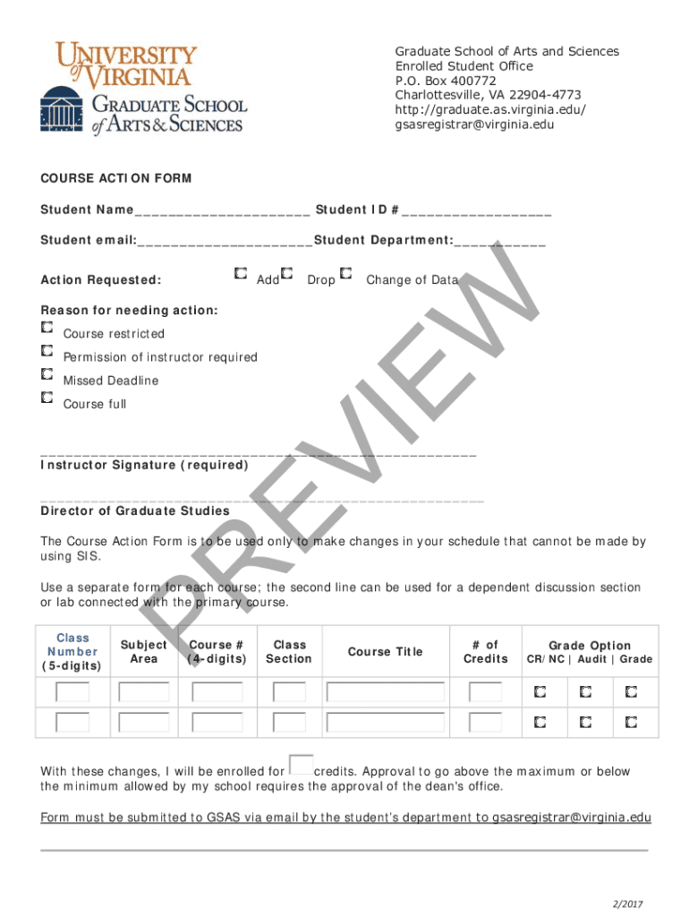 Use this Course Action Form to request changes in your schedule at the Graduate School of Arts and Sciences, University of Virginia. Approval required.