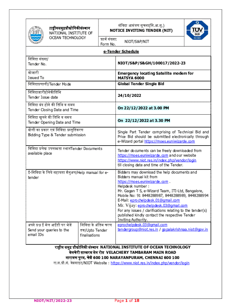 NATIONAL INSTITUTE OF OCEAN TECHNOLOGY (...) NOTICE INVITING TENDER (NIT) : Form No.NIOT/S&P/NITeTender Schedule / Tender No.NIOT/S&P/S&GH/100017/202223 Issued To /Tender ModeEmergency locating