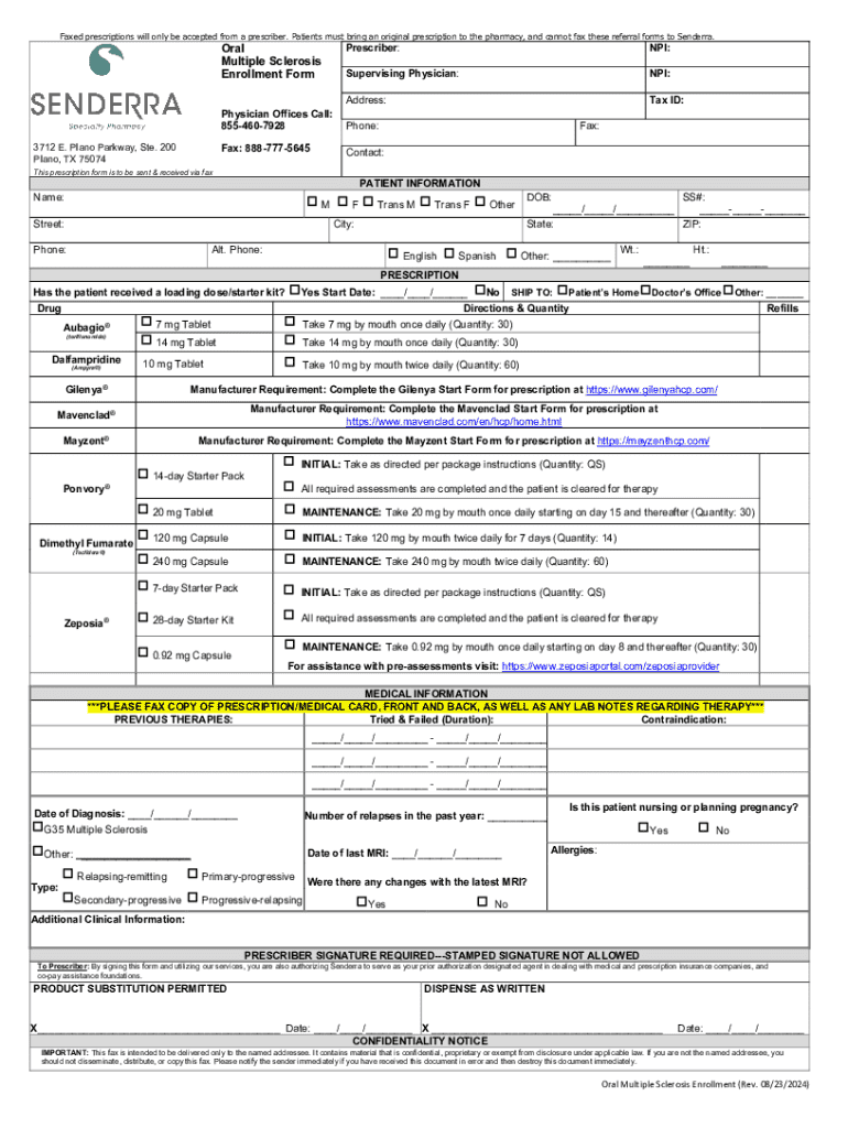 Complete the Oral Multiple Sclerosis Enrollment Form for prescription requests, including patient details, prescription specifics, and prescriber information.